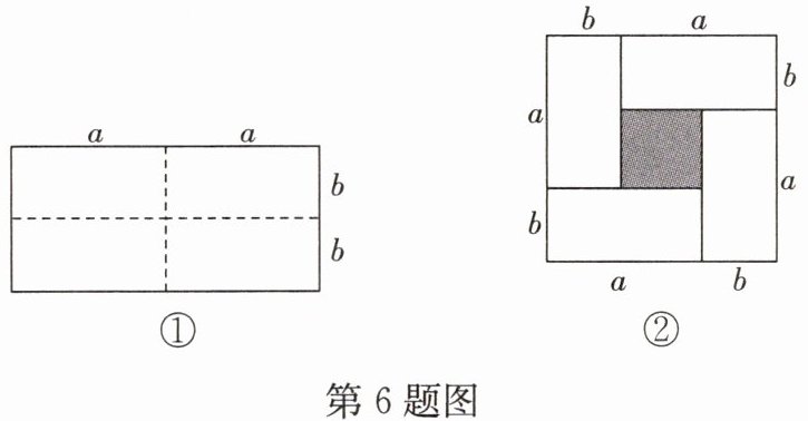 6. 图①是一个长为$2a$、宽为$2b(a>b)$的长方形,沿图中虚线剪开,再按图②的方式摆成正方形,则阴影部分的周长为 ()