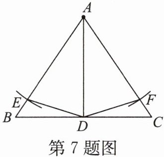 7. (2023·苏州中考)如图,在$\triangle ABC$中,$AB = AC$,$AD为\triangle ABC$的角平分线,以点$A$为圆心、$AD$长为半径画弧,与$AB$,$AC分别交于点E$,$F$,连接$DE$,$DF$。