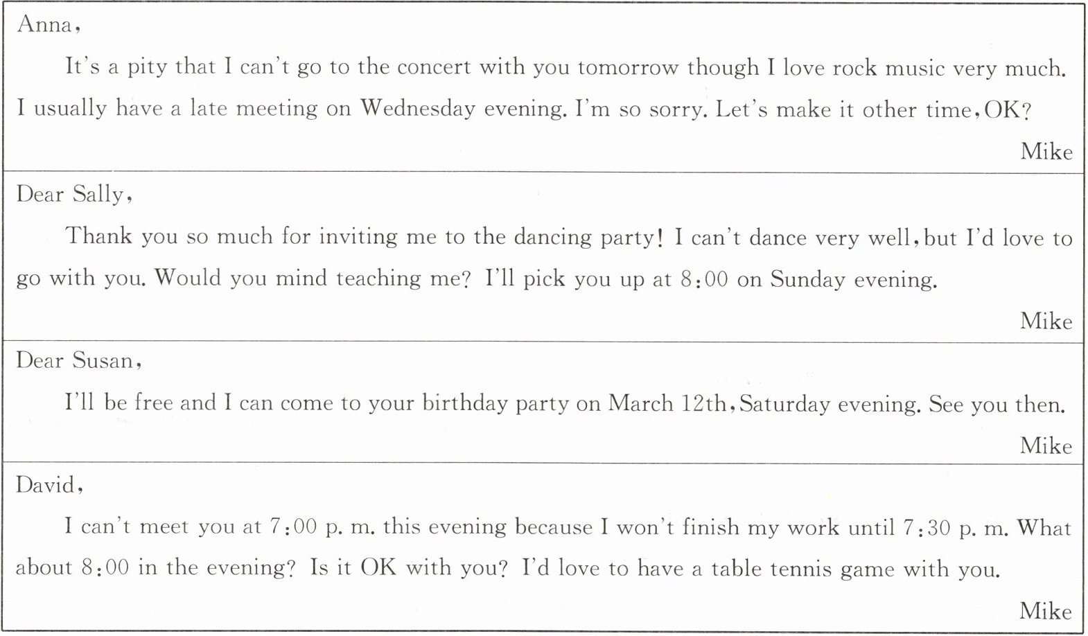 (2024 揭阳期末)Mike has many friends and he is a very popular young man. This month he got four invitations. Here are his replies.
