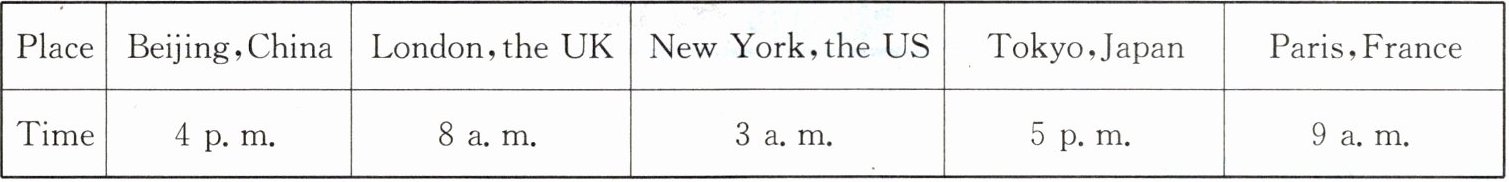 ()5. According to the chart(根据表格) about international time zones, when it is 4:00 p. m. Beijing time on 4th November, it's ______.