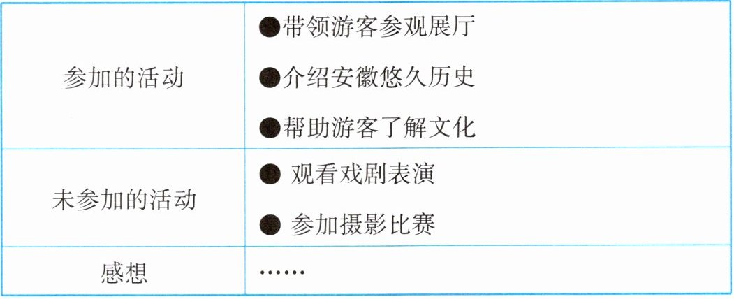 I have worked as a volunteer in the museum. I introduced the long history of Anhui to the visitors from all over the world. Then, I took them to different display rooms where there were lots of fine works and arts. To my surprise, the visitors were so interested in Anhui culture as well as history. With my help, the visitors have known more about Anhui. However, I haven't watched any operas or plays. It was a pity that I lost the chance to learn paper cutting and enter the photo competition.