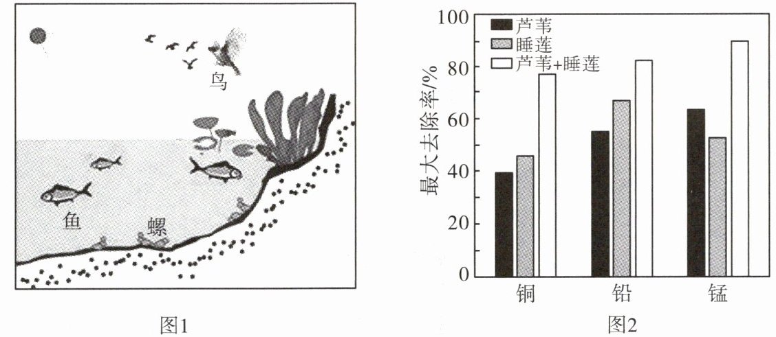 (答出1点即可)。(3)重金属是湖泊湿地环境中的常见污染物。为寻找一种生态修复重金属污染水体的方法,研究人员利用芦苇和睡莲为实验材料,测定了单独种植和混合种植对污染水体中重金属的去除率,结果如图2所示。根据实验结果分析,最合理的种植方案是