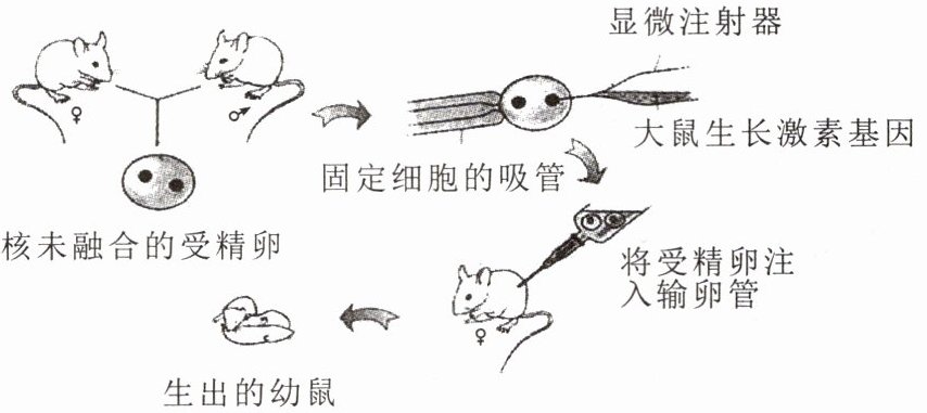 7. 1982 年,英国的《自然》杂志发表了一篇文章,称两个实验小组研制出了转基因超级鼠,也就是把小鼠变成了大鼠。转基因鼠比与它同胎所生的小鼠生长速度快两至三倍,体积大一倍。下面就是该实验的过程图,请据图回答问题。