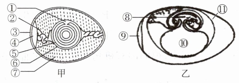9. 公园内的鸽子有时候会主动落到人身上要食物,吸引了许多市民前往观赏,时时展现着“鸽落人身、人手持鸽”的人与动物和谐共处的美好画面。下面为鸽卵及鸽胚胎发育结构示意图,请据图回答问题。