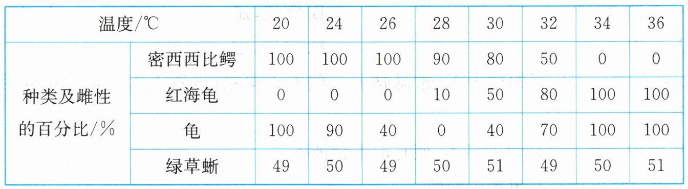 7. 某些卵生爬行动物的受精卵,在不同温度下所发育成的幼体性别比例有所不同。下表中的数据是科学家经过实验得出的,请据表分析回答问题。