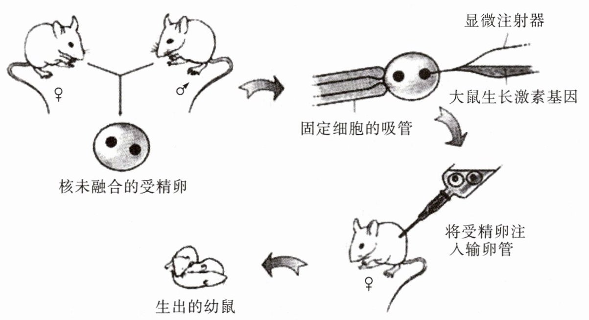 7. 1982 年,英国的《自然》杂志发表了一篇文章:美国的两个实验小组共同研制出了转基因超级鼠,也就是把小鼠变成了大鼠。转基因鼠比与它同胎所生的对照小鼠生长速度快 2~3 倍,体积大 1 倍。下图所示是实验过程,请据图回答问题。