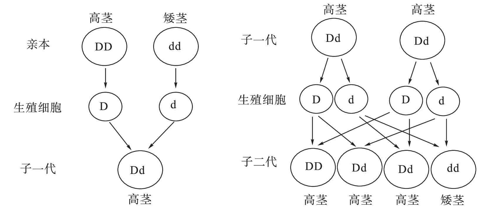 (1)孟德尔选择纯种高茎豌豆与纯种矮茎豌豆进行杂交实验,结果发现杂交后代都是高茎豌豆;他又把杂种高茎豌豆的种子种下去,结果发现长成的植株有高茎有矮茎,不过矮茎的要少得多。豌豆的高茎与矮茎是一对______性状,其中,高茎是______性状。如果用DD表示纯种高茎豌豆,dd表示纯种矮茎豌豆,那么,杂种高茎豌豆的基因组成应表示为______。请画出生殖过程中基因的传递图解。