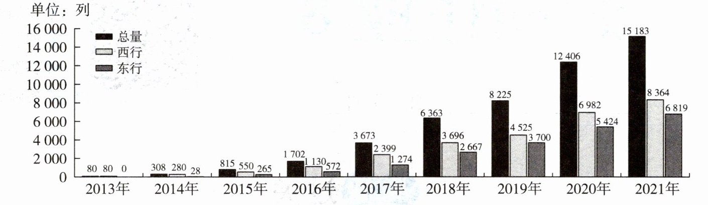 发达。据上图简述2013—2021年中欧班列开行数量的特征:西行、东行和总量都呈上升趋势;西行数量高于东行数量;西行数量增加较快