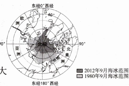 科技的进步与气候变化使得人类探索极地的能力和兴趣与日俱增。如图是极地遥感卫星拍摄的1980年和2012年北冰洋9月份海冰分布范围示意图。读图,完成5~7题。