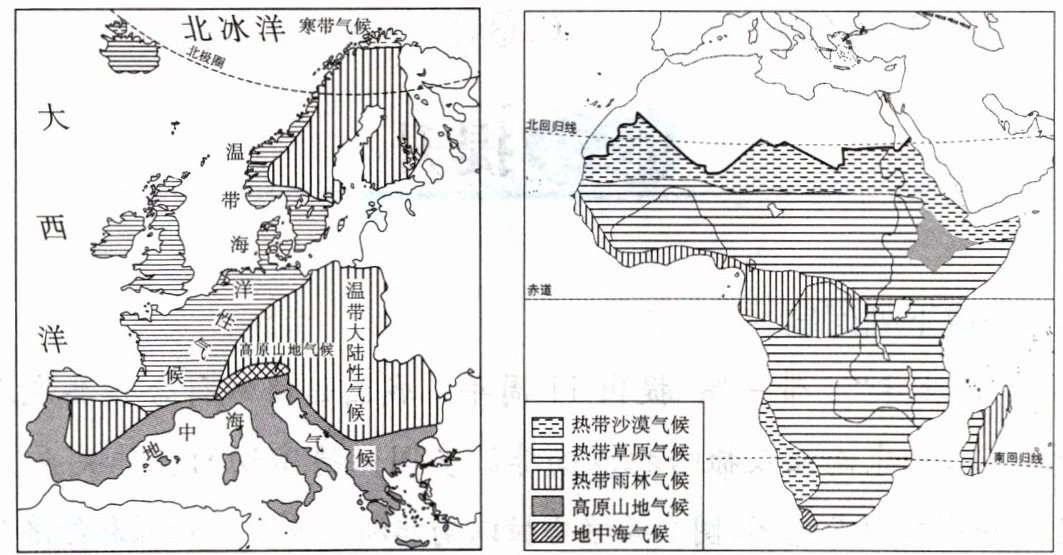 (2024 淮南期末)欧洲西部是世界上发达国家集中的地区;进入 21 世纪,撒哈拉以南非洲成为世界经济发展最快的地区之一。下图为欧洲西部和撒哈拉以南非洲的气候类型分布图。读图,完成 3~5 题。