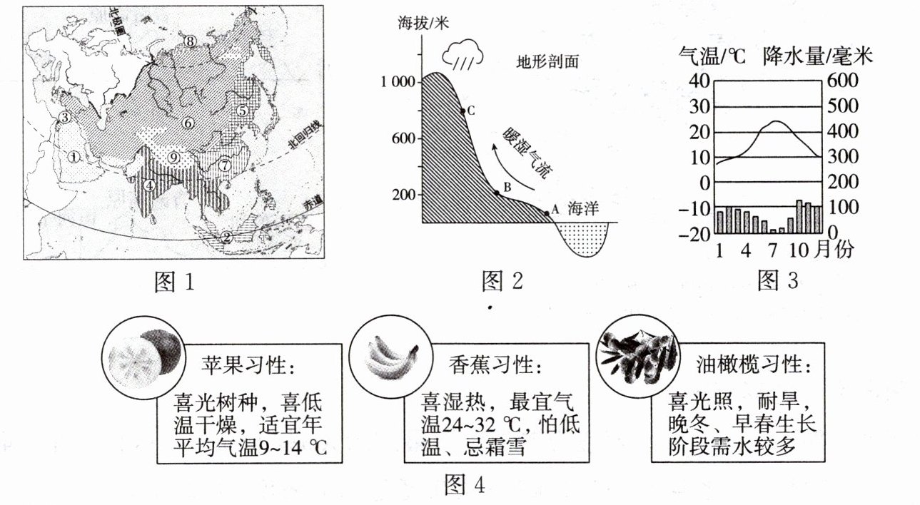 材料二 图1是亚洲气候类型分布图,图2为高山高原地区对气温、降水影响示意图,图3为地中海气候的气温曲线和降水量柱状图,图4为三种水果的生长习性卡片。