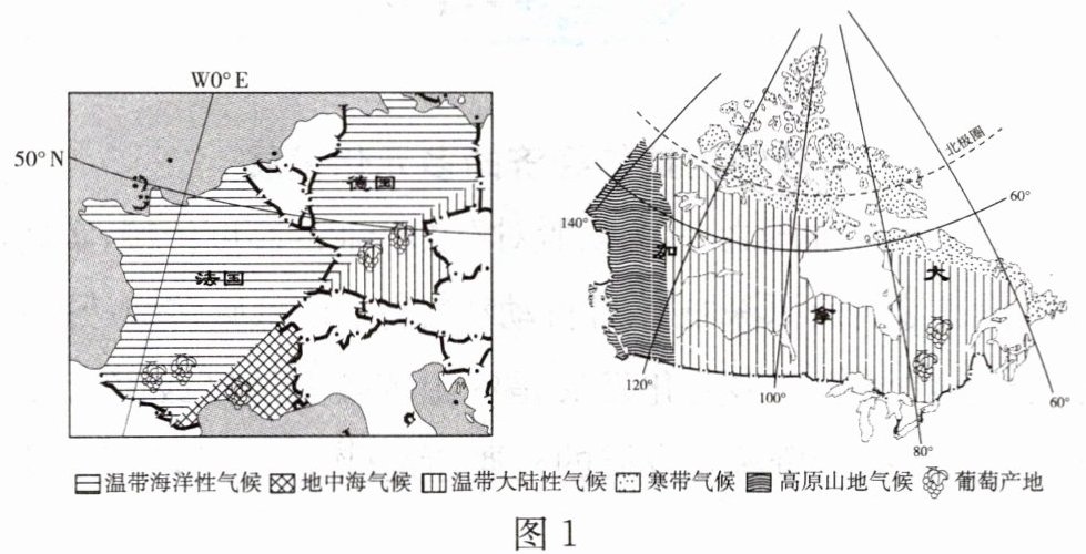 (2)与法国相比,德国纬度较高。图中德国的葡萄种植地位于____