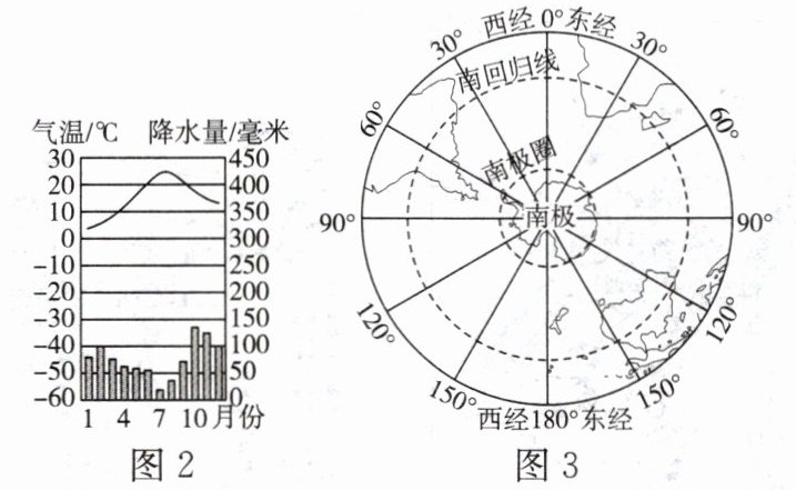 9. 某校开展“绘地图,找产地”的实践活动。图 1 是同学们绘制的法国、德国、加拿大气候类型及葡萄产地分布图,图 2 是地中海气候的气温曲线和降水量柱状图,图 3 是以南极为中心的半球图。阅读图文材料,完成下列问题。