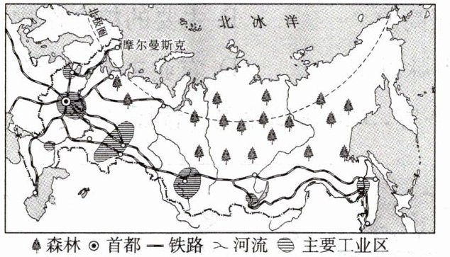 俄罗斯木材产量居世界第一,但因其树木生长缓慢,森林资源的增长速度较慢。如图为俄罗斯地理位置和森林资源分布示意图。读图,完成1~2题。