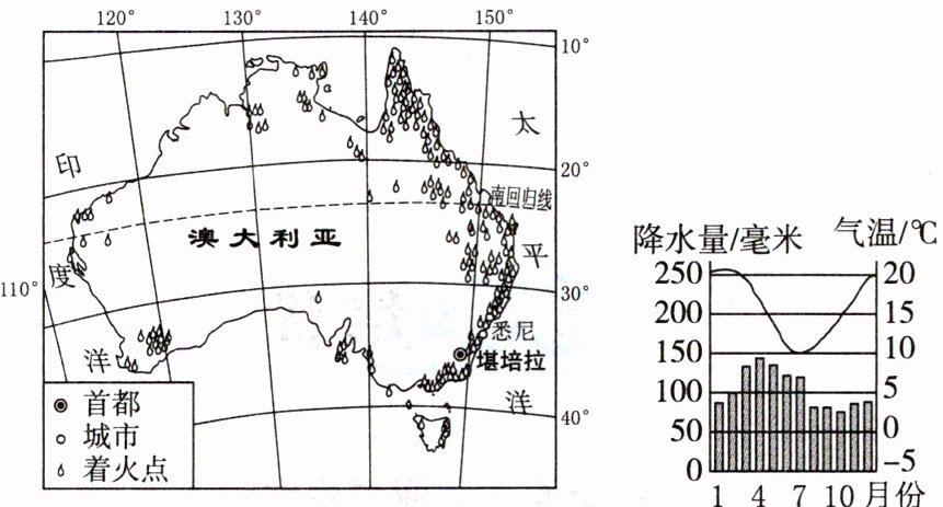 11. (2024 宿州期末)澳大利亚是一个森林大火频发的国家,2019—2020 年的森林大火(自 2019 年 9 月起)持续了四个多月,数十亿只动物葬身火海,多个城市受到森林火灾所产生的烟雾影响。读澳大利亚森林大火分布示意图和悉尼气候资料图,完成下列问题。