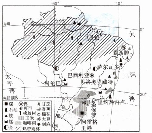 (2024 广东揭阳一模)中国与巴西同属发展中国家,两国在农业、工业等领域进行了广泛合作。读巴西矿产和农作物分布图,完成 3~4 题。