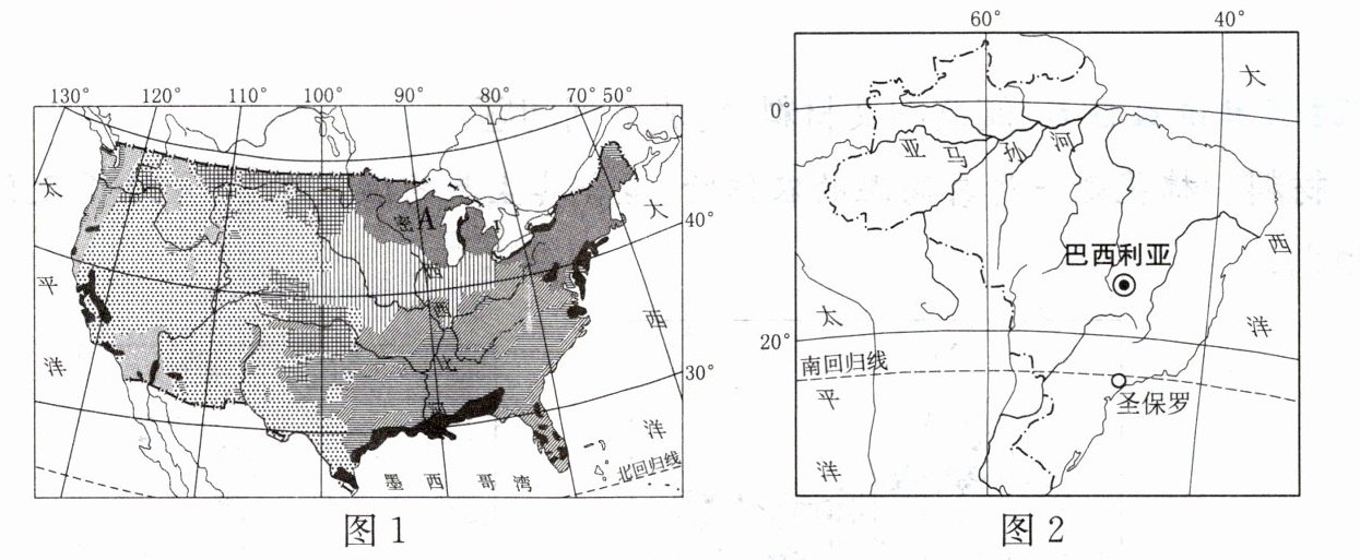 12. 运用对比分析法,可以帮助我们更好地认识国家,提升区域认知素养。读美国本土农业带(区)分布图(图 1)和巴西简图(图 2),完成下列问题。