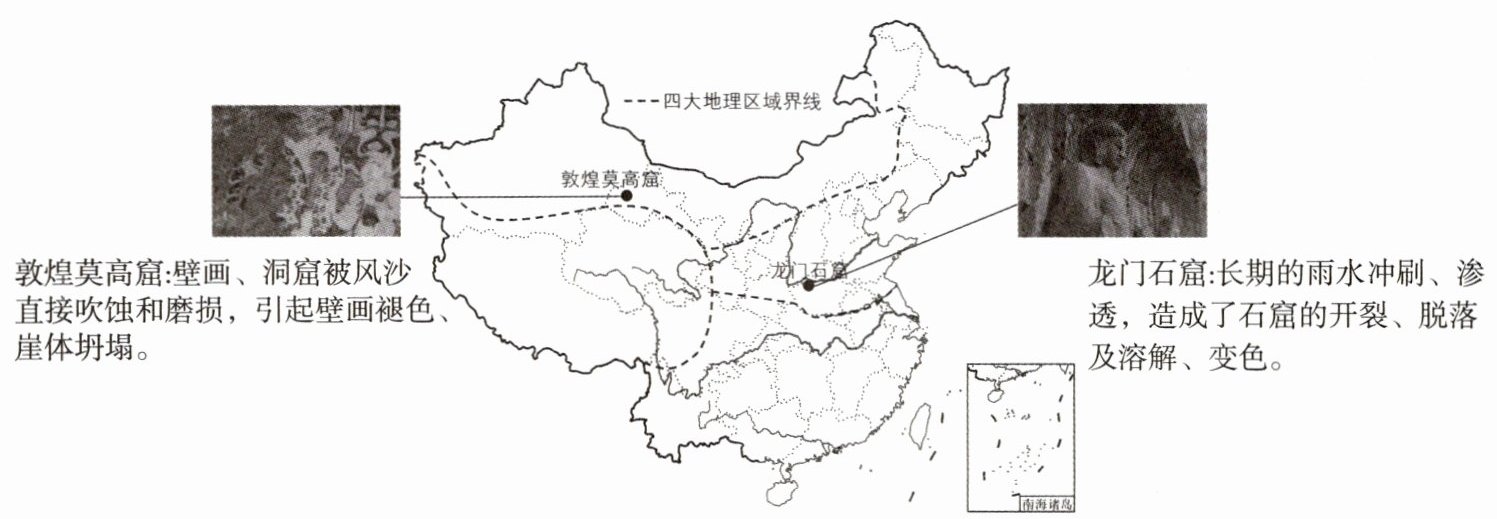 3. 敦煌莫高窟和龙门石窟面临的主要问题分别是 ( )