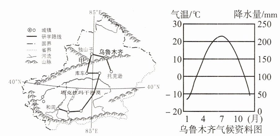 新疆维吾尔自治区是我国西北内陆的重要省区。某中学地理兴趣小组利用暑期从托克逊出发,开启新疆地理研学之旅。下图为新疆研学路线图和乌鲁木齐气候资料图,据此完成 6~7 题。