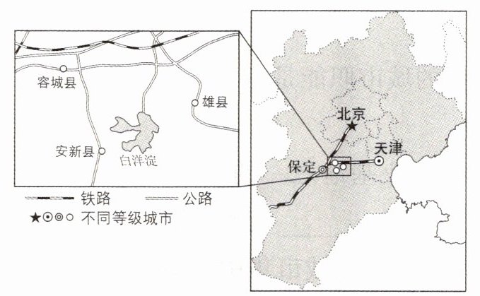 北京市面积为1.68万平方千米,2016年常住人口达2195万多,交通、环境质量改善较难。2017年中共中央、国务院决定建立雄安新区(如图),其规划范围涵盖雄县、容城和安新三县及周边部分区域,集中疏解北京非首都功能,为解决“大城市病”提供中国方案,建设绿色智能新城。据此完成8~10题。