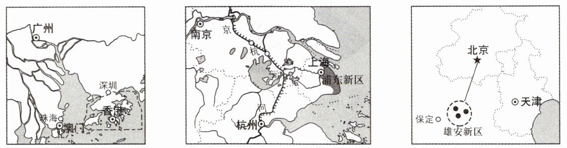 12. 1979 年国家首先选择珠江三角洲设立经济特区,1990 年国家决定开发浦东新区,2017 年国家决定设立又一具有全国意义的雄安新区。如图分别为珠江三角洲、浦东新区和雄安新区位置图。据此完成下列小题。