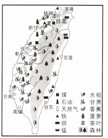 “台湾岛啊,我的故乡,多么美好的地方。阿里山森林,一望无边,好像大海洋。蔗糖甜啊稻米香,日月潭呀好风光……海峡碧波挽起两岸,骨肉情更长……”歌曲《台湾岛我的故乡》唱出了宝岛台湾的富饶,也唱出了海峡两岸的骨肉情长。下图为台湾岛主要农矿产品分布示意图。据此完成5~6题。