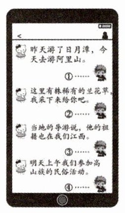 暑假小芳外出旅游,期间她与同学小红分享了旅游经历。读她们之间的微信对话片段图,完成1~2题。