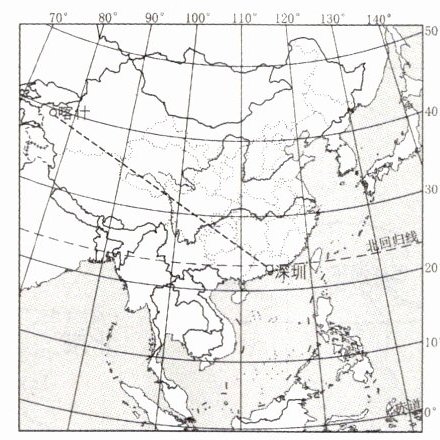 2024 年国庆节假期,家住深圳的畅畅乘坐某航班前往喀什旅游,该航线里程 5008 千米,飞行时长 6 小时 45 分钟,是目前国内最长直飞航线。下图为深圳——喀什航线示意简图。据此完成 7~9 题。