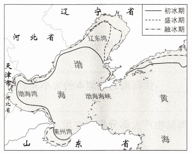 当海水温度下降至约$-1.3^{\circ }C$时,海水会冻结成冰。在世界各大洋中,北极圈以北的北冰洋地区是海冰分布最广的海域。渤海是北半球海冰分布最南的地区,也是我国唯一有大面积海冰分布的海域。读“渤海海冰示意图”,完成 3~5 题。