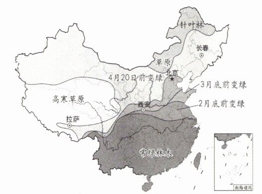 (2)与西安相比,拉萨纬度位置更____(高/低),但拉萨树叶变绿的时间比西安更____(早/晚),导致这种差异的主要影响因素是____。