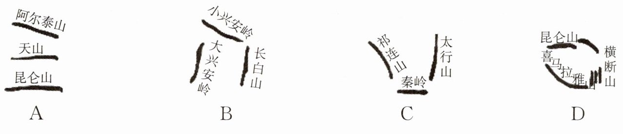 10.我国的地形复杂多样、山区面积广大,尤其是纵横交错的山脉,构成了地形的骨架,高原、平原、盆地和丘陵镶嵌其间。下图中表示黄土高原范围的是()