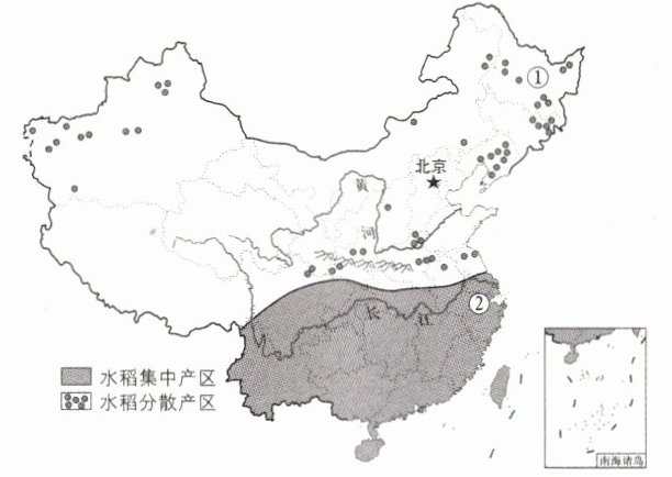 水稻生长好暖喜湿,我国是世界水稻种植最早的国家。“杂交水稻之父”袁隆平先生的研究成果,使“中国人的饭碗牢牢地端在自己手里”。读中国水稻产区分布图,完成1~3题。