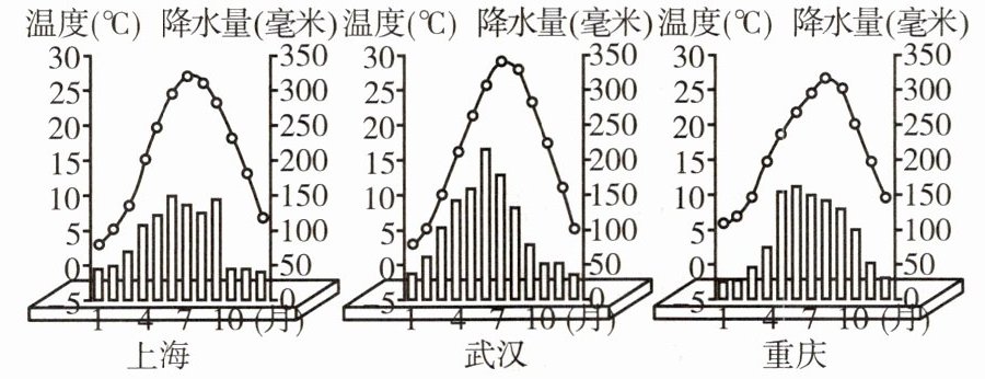 11. 读“上海、武汉、重庆年内各月气温与降水量分配图”,回答下列问题。