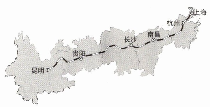 上海某中学八年级学生开展暑假研学活动,他们计划乘沪昆高铁开展长江流域研学旅行。“沪昆高铁线路示意图”,完成9~10题。