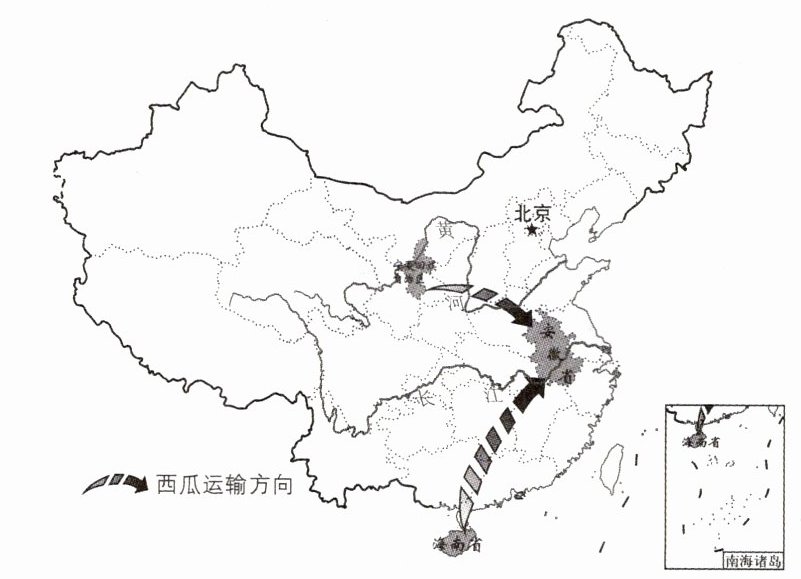 12. 安徽是传统西瓜种植大省,改革开放40多年来,安徽市场上不仅能买到本地产西瓜,还能购买到宁夏、海南等地产的西瓜,读“宁夏、海南向安徽输送西瓜示意图”,完成下列题目。