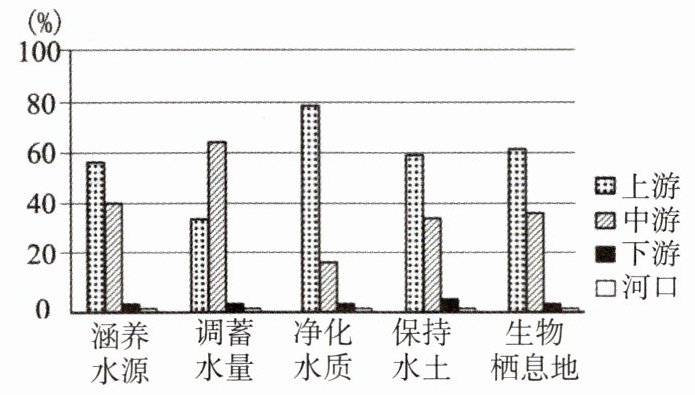 维护长江流域环境对保障我国生态安全具有重要意义。下图示意长江各河段五种生态保护功能所占比重,读图完成3~4题。