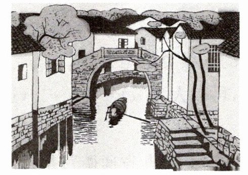 中国人画中国画,中国画画中国文化,民居文化是我国传统文化瑰宝之一。读版画《桥之春》(下图),完成1~2题。
