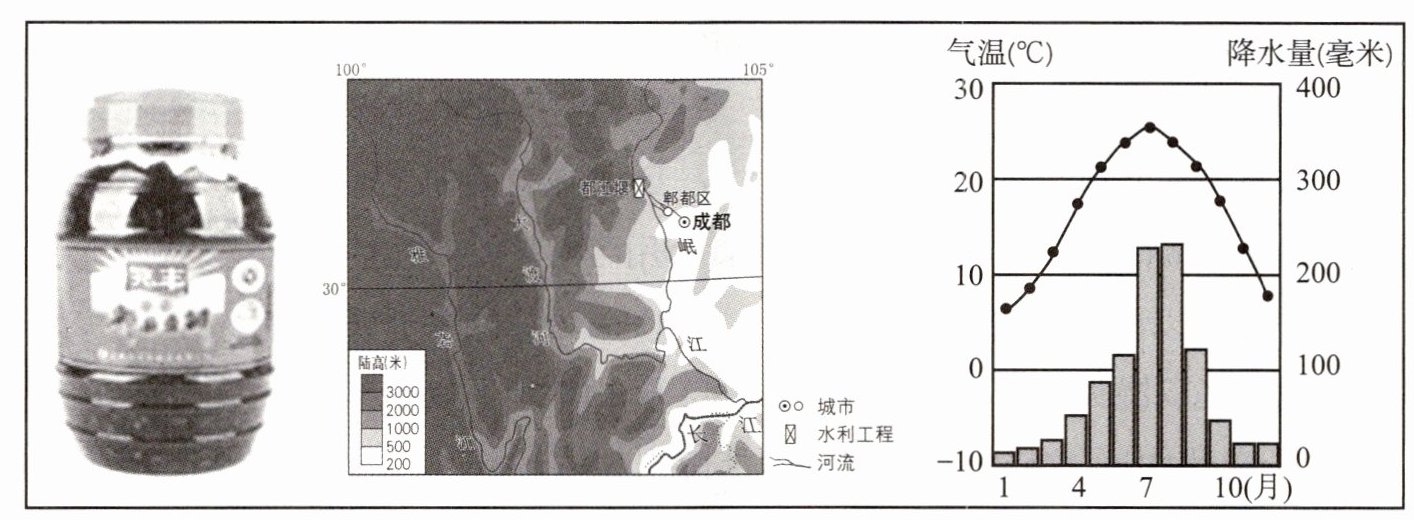 美食节目是许多同学爱看的电视内容,一道道精美的菜肴让人垂涎欲滴。川菜属于我国八大菜系,而有着300余年历史的“郫县豆瓣”享有“川菜之魂”的美誉。郫县豆瓣酱的主要原料是当地生产的优质蚕豆。郫县现在为成都市郫都区。读“郫都区周边区域示意图和郫都区气温曲线与降水量状图”,完成1~3题。