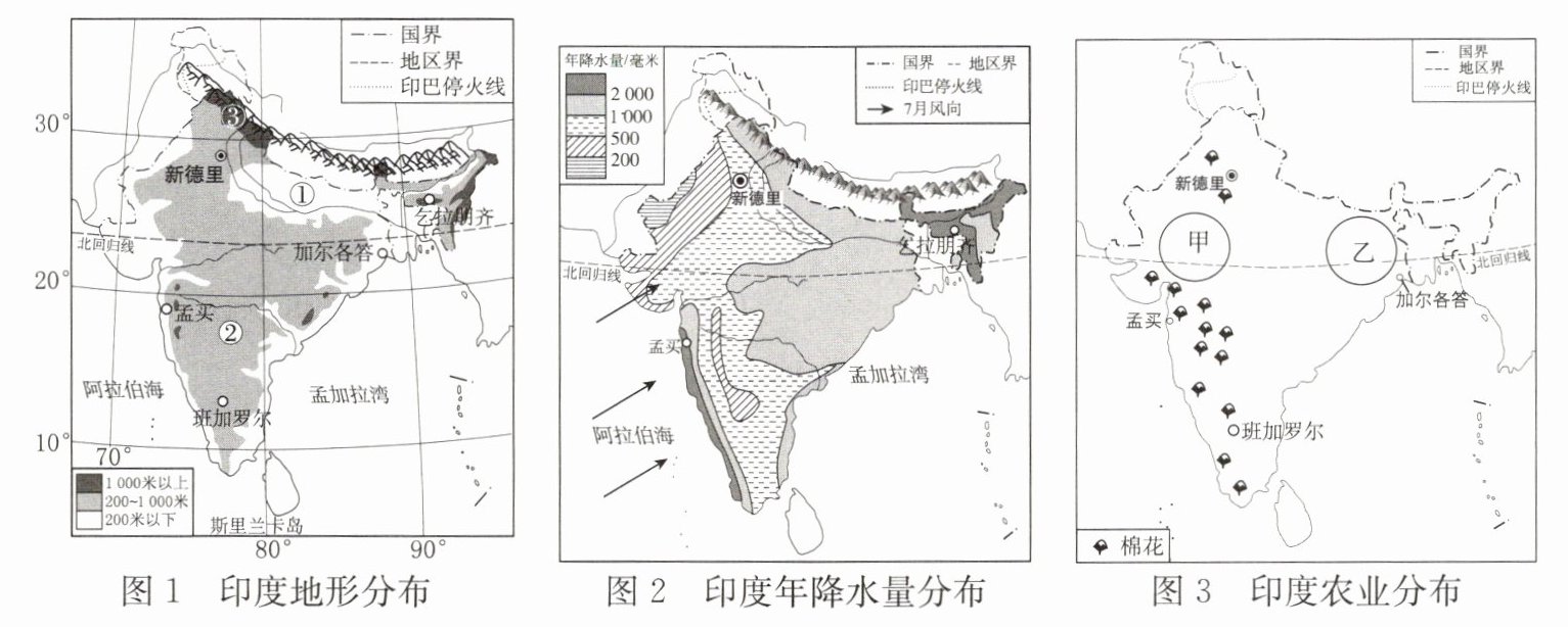 。印度耕地面积广,为粮食生产提供了有利条件。(2) 关注气候:印度年降水量最多的地区主要分布在印度东北部以及德干高原