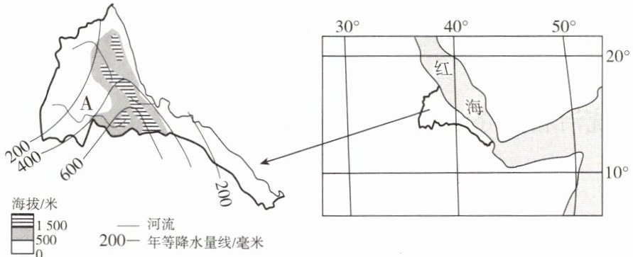 10.(2024 淮北期末)厄立特里亚是我国农业交流合作的重要国家之一。该国经济落后,以旱地农业为主,传统能源主要依赖生物燃料,电力严重缺乏。中国某农企研究工作站在当地援建以光伏发电为动力的滴灌工程,并辅以膜下滴灌技术。下图为厄立特里亚地理位置及地形、降水量分布图。结合图文材料,完成下列问题。