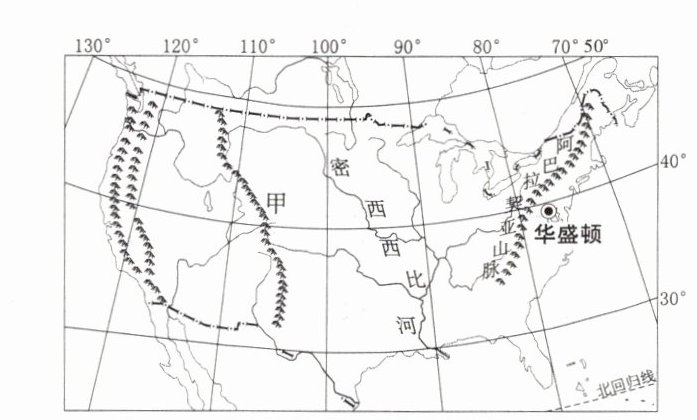 (1)美国地形呈南北纵列分布,其中甲为____(填“落基”或“安第斯”)山脉。地势平坦的____(填“东”或“中”或“西”)部地区有“龙卷风走廊”之称,每年春夏季,来自北冰洋的冷干气流与来自墨西哥湾的____气流在此交汇,容易形成龙卷风。