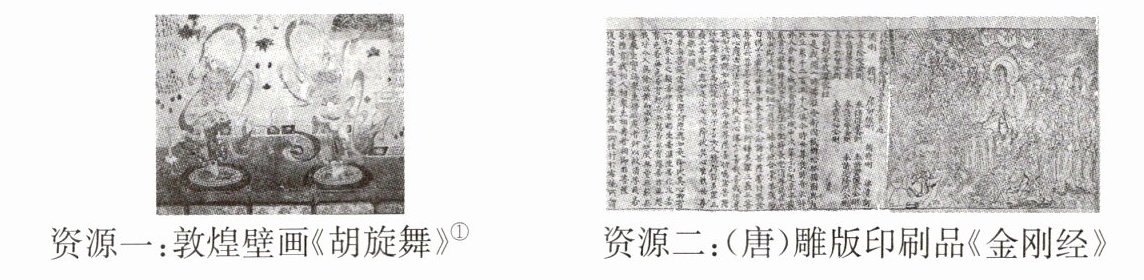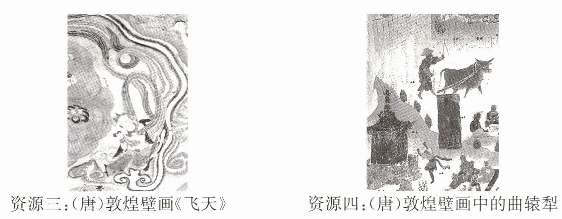 资源:雕版印刷品《金刚经》、敦煌壁画中的曲辕犁。主题:唐代技术创新。阐释:隋唐时期发明了雕版印刷术,促进了文化的发展;唐代农业生产技术不断改进,曲辕犁等重要的生产工具得以发明和推广,有效提高了粮食亩产量。
