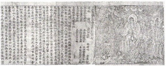 图1 唐代雕版印经(局部),版画精美,雕版楷书秀丽,卷尾题记有“咸通九年”(唐懿宗时期)字样。