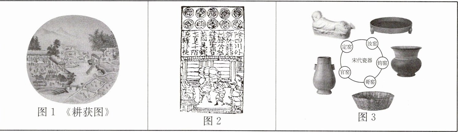 图 1 是《耕获图》,展现了宋代水稻从耕作到收获的情景,对于研究宋代农业生产方式、生产工具等有重要价值。图 2 是北宋纸币铜版拓片,北宋时期,四川地区出现“交子”,这是世界上最早的纸币。这反映了宋代商品经济的发展,对于研究宋代商品贸易具有重要价值。图 3 是宋代五大名窑,反映宋代制瓷业的发展,对于研究宋代手工业具有重要价值。(任选其一,言之有理即可)