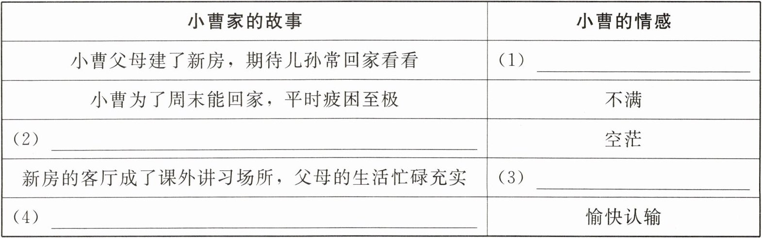 1. 结合文章内容和小曹的情感变化,把下面的表格补充完整。