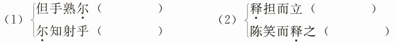 1.(1)同“耳”,相当于“罢了”。你。(2)放下。打发。2.(1)(卖油翁)见到他射出的箭十支能中八九支,只是对他微微点头。(2)从前陈尧咨凭借着自己射箭的技术而自傲。3.C【解析】“睨之”“但微颔之”表现了卖油翁并不认为陈尧咨射箭的技术有多么值得夸耀,只是手熟罢了,并不是表现他“轻蔑自负”。4.我认为这样修改好,因为改定稿甲文采用反问句式,“亦”“不亦”加强语气,更能突出陈尧咨的骄傲个性。