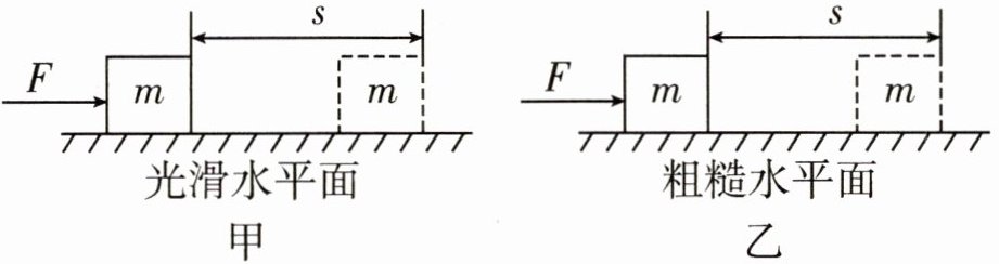 9. 小红同学先后用同样大小的力 F 使同一木箱分别在如图所示的甲、乙两个表面上沿力的方向移动相同的距离 s,该力 F 在这两个过程中所做的功 $W_{甲}$______(选填“>”“=”或“<”)$W_{乙}$。