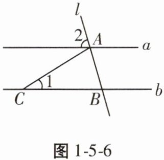 8. 如图1 - 5 - 6,直线a//b,直线l与直线a,b分别相交于点A,B,点C在直线b上,且CA = CB。若∠1 = 32°,则∠2的度数为(