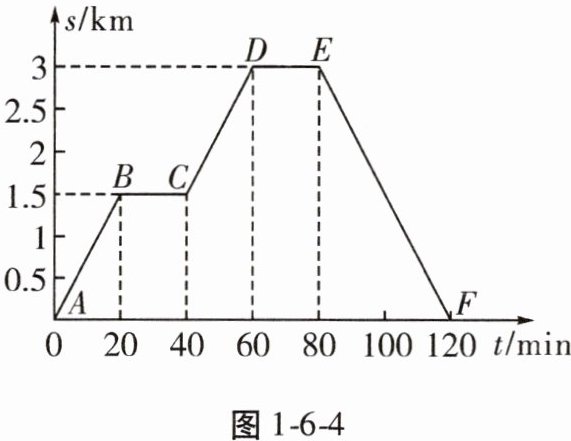 14. 甲同学从图书馆出发,沿笔直路线慢跑锻炼,已知他离图书馆的距离s(km)与时间t(min)之间的关系如图1-6-4所示,请根据图像直接回答下列问题。