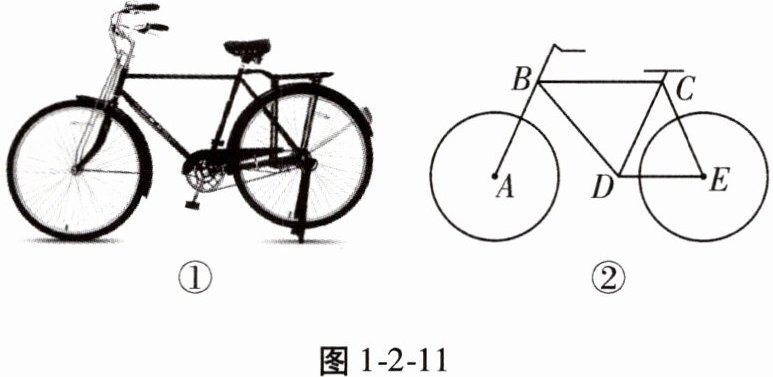 13. 如图1-2-11①,“二八大杠”传统老式自行车承载了一代人的回忆,图②是它的几何示意图。已知$BC// DE$,$AB// CD$,当$\angle ABD = 70^{\circ}$,$\angle CBD = 44^{\circ}$时,$\angle CDE$的度数为
